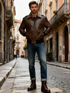 The Aviator Real Cowhide Distressed Brown Leather Bomber Flight Vintage Jacket combines timeless aviation style with rugged, vintage charm. Crafted from high-quality real cowhide leather, this jacket offers exceptional durability and a luxurious feel. The distressed brown finish gives it a unique, worn-in look that adds character, making each jacket one-of-a-kind. With its classic bomber design, ribbed cuffs, and cozy collar, it provides both warmth and comfort, making it perfect for cold weather or casual wear. Whether you're an aviation enthusiast or simply appreciate classic leather fashion, this jacket is sure to become a standout piece in your wardrobe.