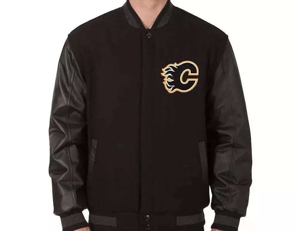 Calgary Flames Black Varsity Jacket With Genuine Leather Sleeves