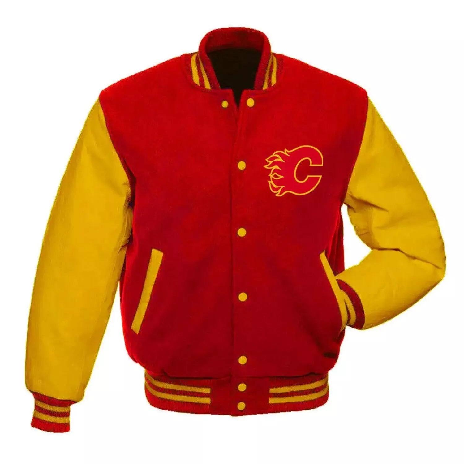 Show off your team spirit with the Calgary Flames Red and Yellow Varsity Jacket. Designed with a vibrant red and yellow color scheme, this jacket exudes the energy and passion of the Flames. Whether you're heading to the rink or out on the town, the jacket's bold colors and embroidered team logo make it an excellent choice for any fan of the Flames looking to add a pop of team pride to their wardrobe.