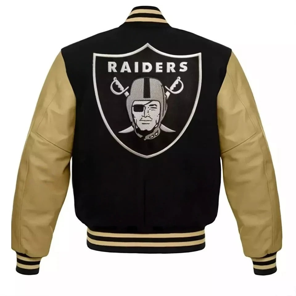 This jacket is designed to stand out with its traditional varsity look, including ribbed cuffs, collar, and hem for a snug fit. The snap-button closure allows for easy wear, making it ideal for game day or casual outings. Whether you're at a Raiders game or hanging out with friends, this jacket will keep you warm and stylish while showing off your team pride.