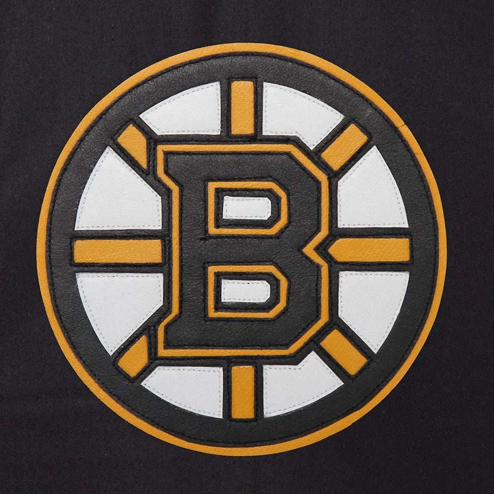 Support the Boston Bruins in this premium varsity jacket, designed with a black wool body and contrasting genuine leather sleeves. This jacket strikes the perfect balance between classic sportswear and rugged outerwear, making it ideal for chilly game days or everyday casual wear.