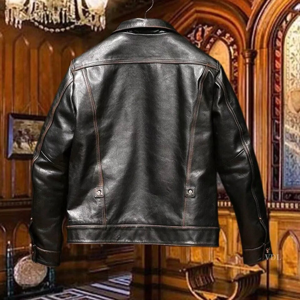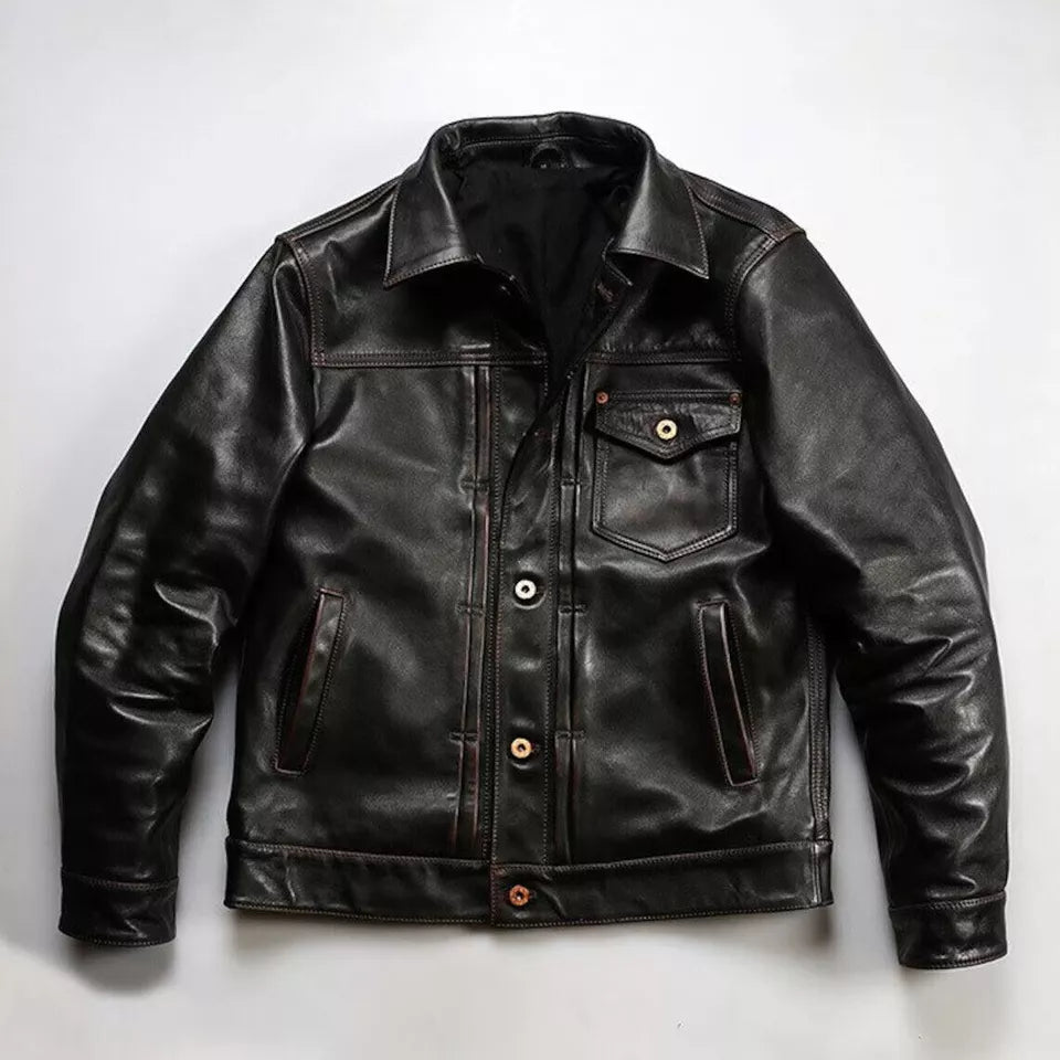 Men Distressed Trucker Cowhide Leather Luxury Tanned Cafe Racer Motorcycle Coat
