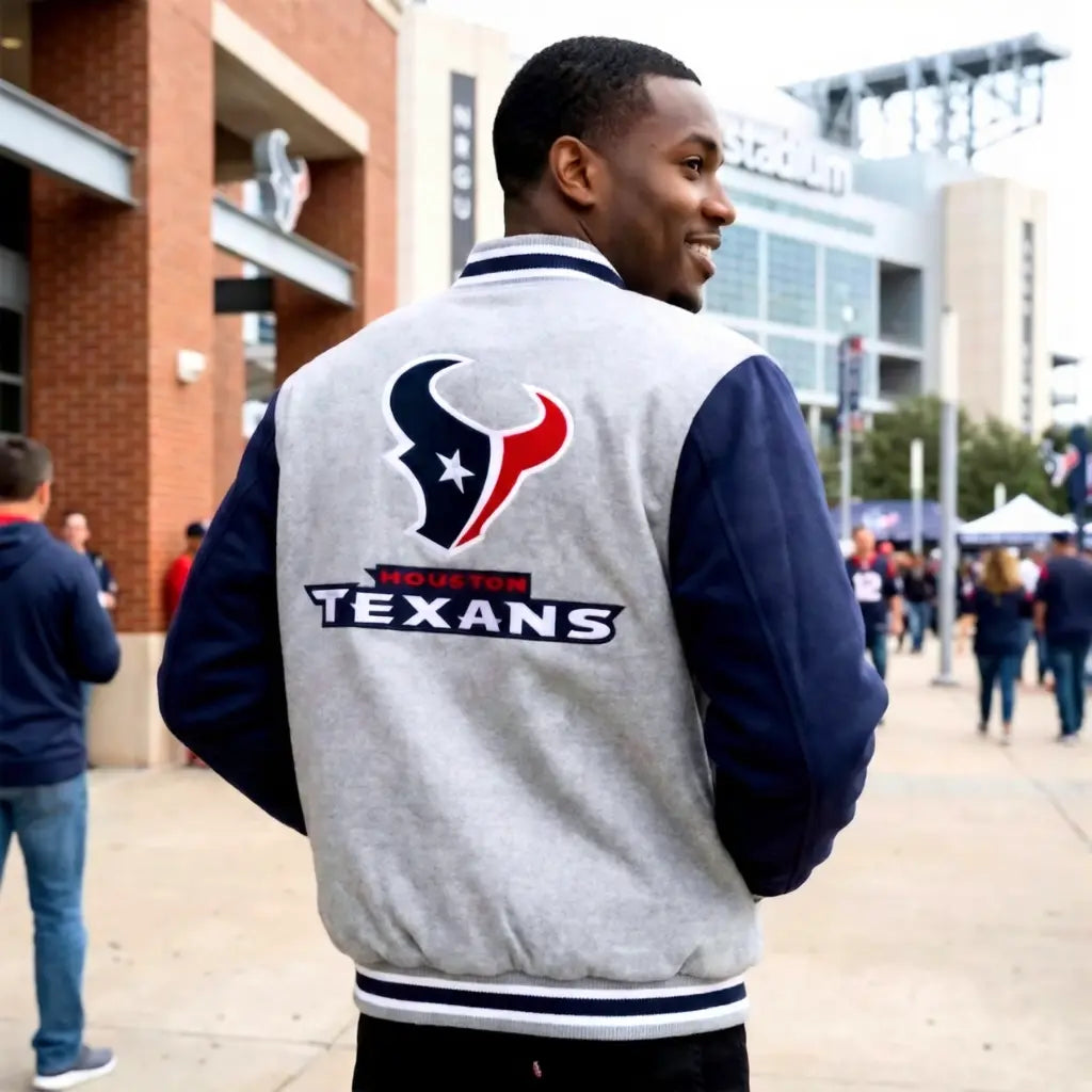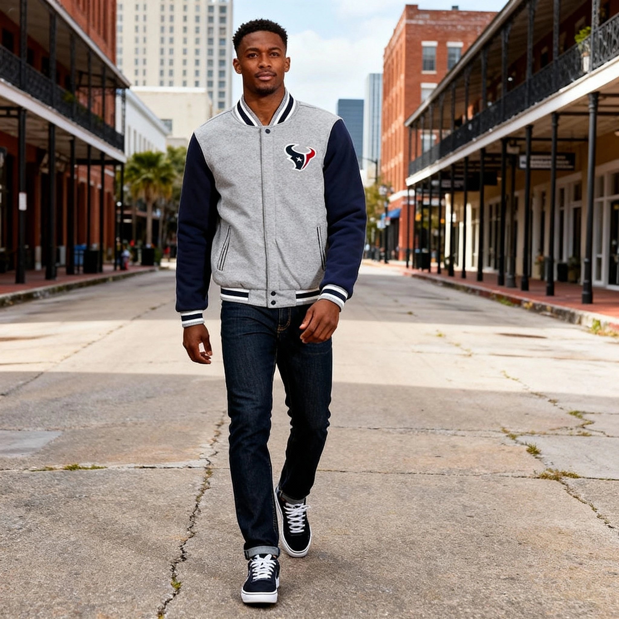 Represent your Houston Texans pride with this premium gray and navy varsity wool jacket. Combining classic letterman styling with official NFL team branding, this jacket delivers both heritage appeal and game-day ready comfort.