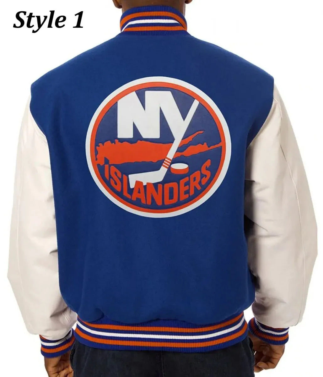 Rep your team in style with the Men NY Islanders Blue and White Style 1 Letterman Jacket. Combining the iconic Letterman design with the classic New York Islanders team colors, this jacket is perfect for showing your loyalty on game day or everyday wear. Designed for ultimate comfort and durability, it features premium wool construction and genuine leather sleeves, making it a standout piece for any hockey fan.