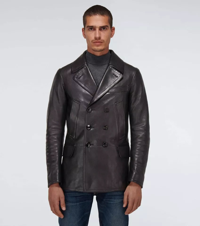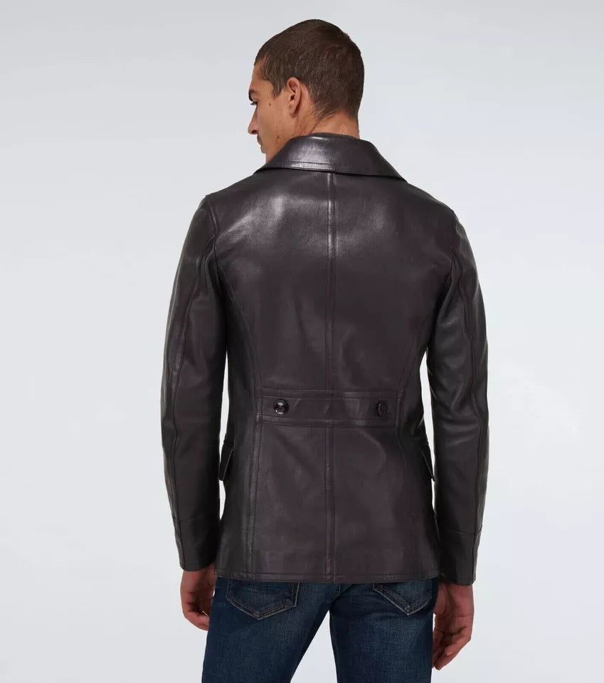 The Men’s Tailored Lambskin Leather Jacket combines sleek sophistication with durability. Made from premium black lambskin leather, this double-breasted coat is designed for a sharp, tailored fit, making it perfect for formal occasions, business wear, or stylish everyday outfits.