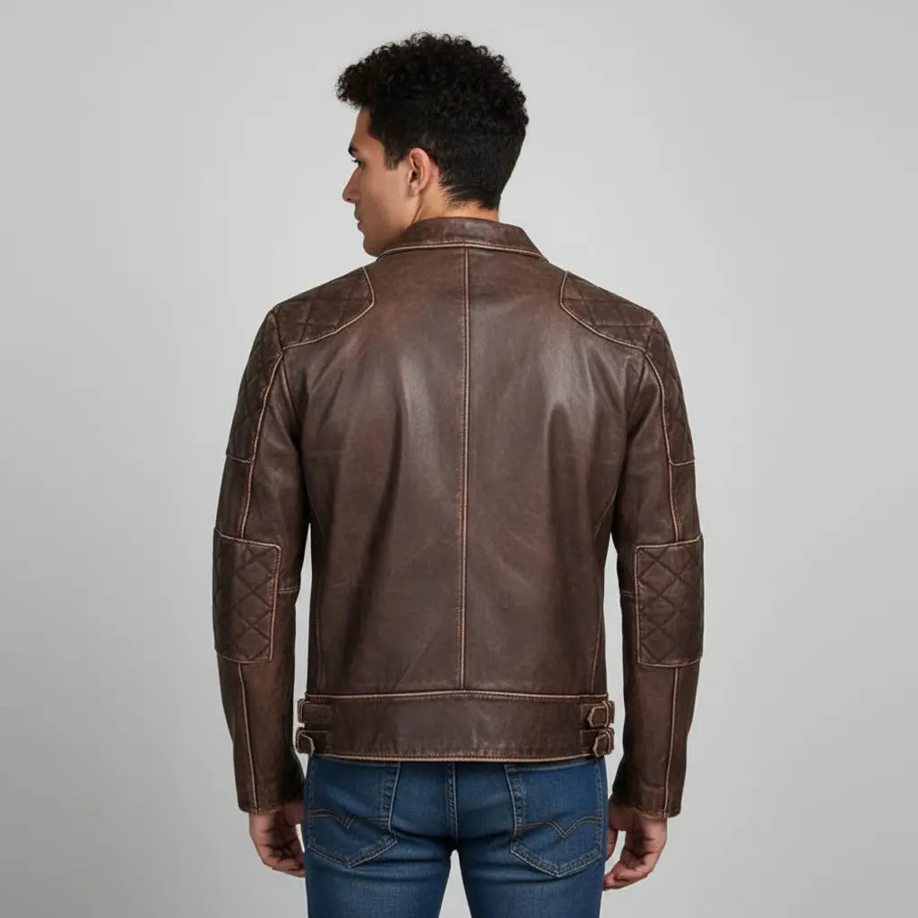 The Men's Biker Cafe Racer Vintage Motorcycle Distressed Brown Leather Jacket is the perfect blend of classic biker style and modern design. Made from high-quality distressed brown leather, this jacket exudes a vintage, rugged appeal that only improves with age. The cafe racer design adds a sleek and streamlined look, while the durable leather provides both style and protection. Featuring moto-inspired details such as sturdy stitching, a zip-up closure, and a comfortable fit, this jacket is perfect for motorcycle riders or anyone looking to add a bold, edgy piece to their wardrobe. Whether you're on the bike or out for a night out, this jacket combines practicality with a timeless aesthetic.