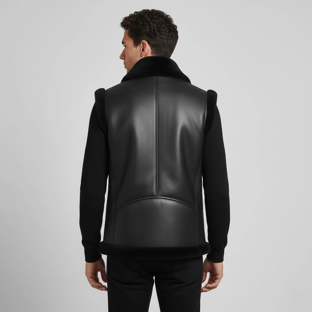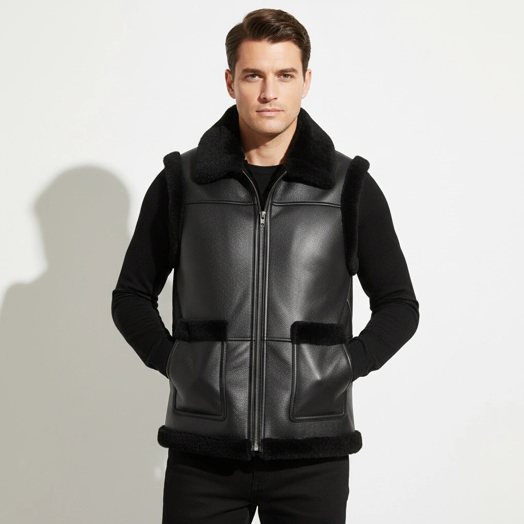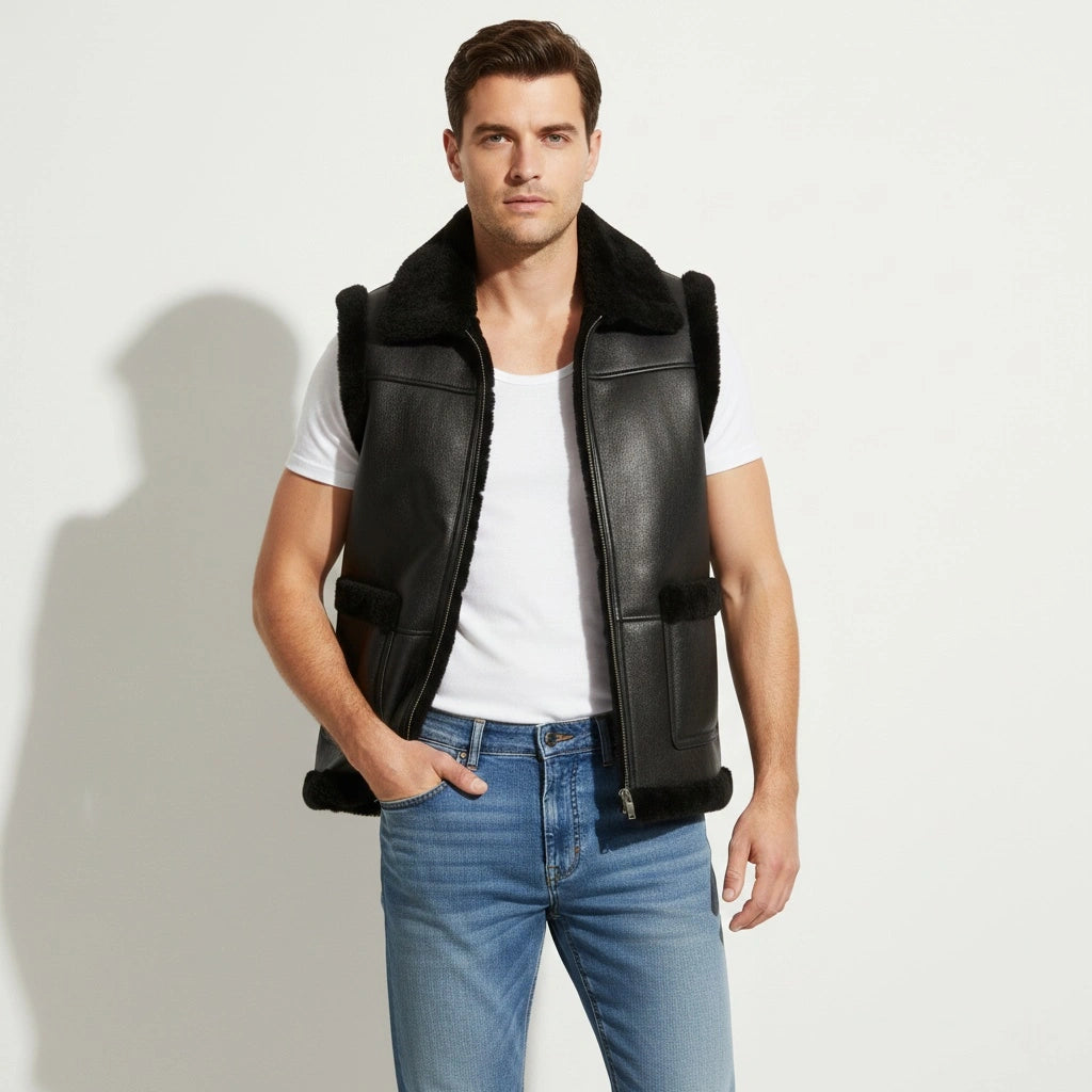 Stay sleek and warm with the Men’s Black Real Fur Vest. Crafted from genuine sheepskin leather, this sleeveless jacket features a soft fur lining that offers comfort and luxury. Perfect for layering in colder weather or as a statement piece for any casual outfit.