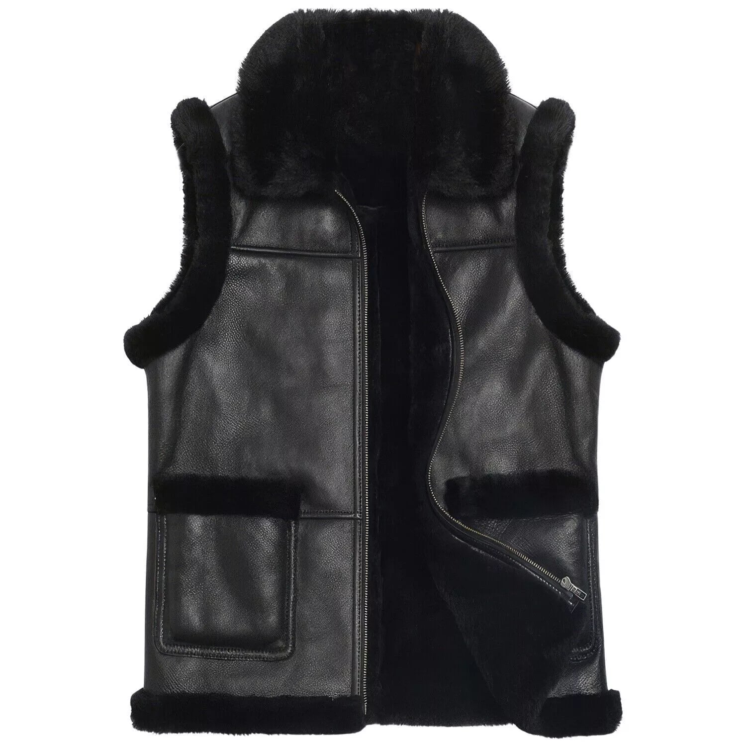 Men's Black Real Fur Vest Sleeveless Genuine Sheepskin Leather Jacket Coat
