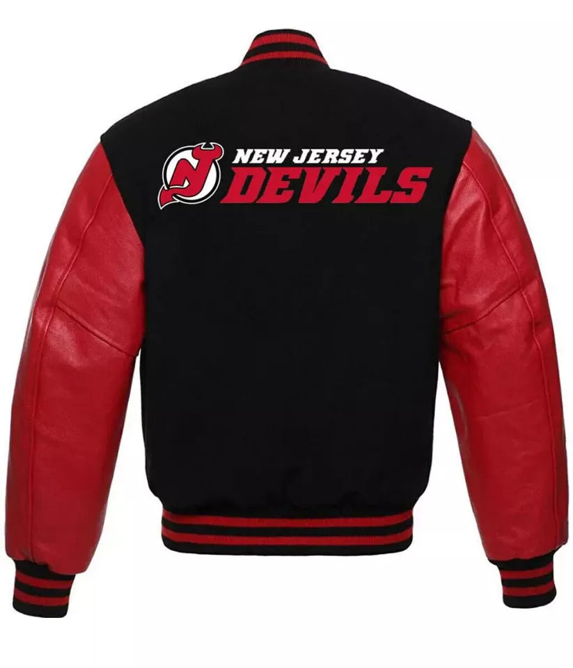 Show your New Jersey Devils pride with this sleek Black and Red Letterman Varsity Jacket, featuring genuine leather sleeves for a premium look and feel. The bold black wool body is contrasted by vibrant red leather sleeves, creating a striking combination. The embroidered Devils logo adds authenticity, while ribbed cuffs, collar, and waistband ensure a comfortable, snug fit. Perfect for game days, casual outings, or as a collector's item, this jacket is a must-have for any true Devils fan."
