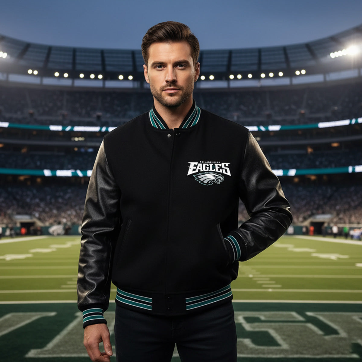 Rep your Philadelphia Eagles in style with this Black Letterman Varsity Jacket featuring genuine leather sleeves. The sleek black body complements the authentic leather sleeves for a premium look and feel. Embroidered Eagles logos bring team pride to the forefront, while ribbed cuffs, collar, and waistband provide a snug, comfortable fit. Whether you're cheering on the Eagles, going for a casual look, or adding to your collection, this jacket is a must-have for any true fan."
