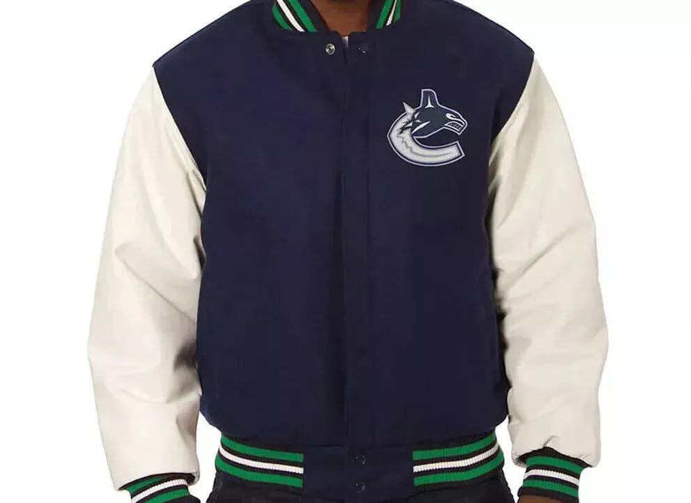 Rep your Vancouver Canucks pride with this Navy and White Letterman Varsity Jacket. Featuring a classic navy wool body and white leather sleeves, this jacket delivers a timeless varsity look. The embroidered Canucks logo adds authenticity and team spirit, while the ribbed cuffs, collar, and waistband ensure a comfortable, secure fit. Whether you're at the game, hanging out with friends, or adding to your collection, this jacket is a must-have for every true Canucks fan."