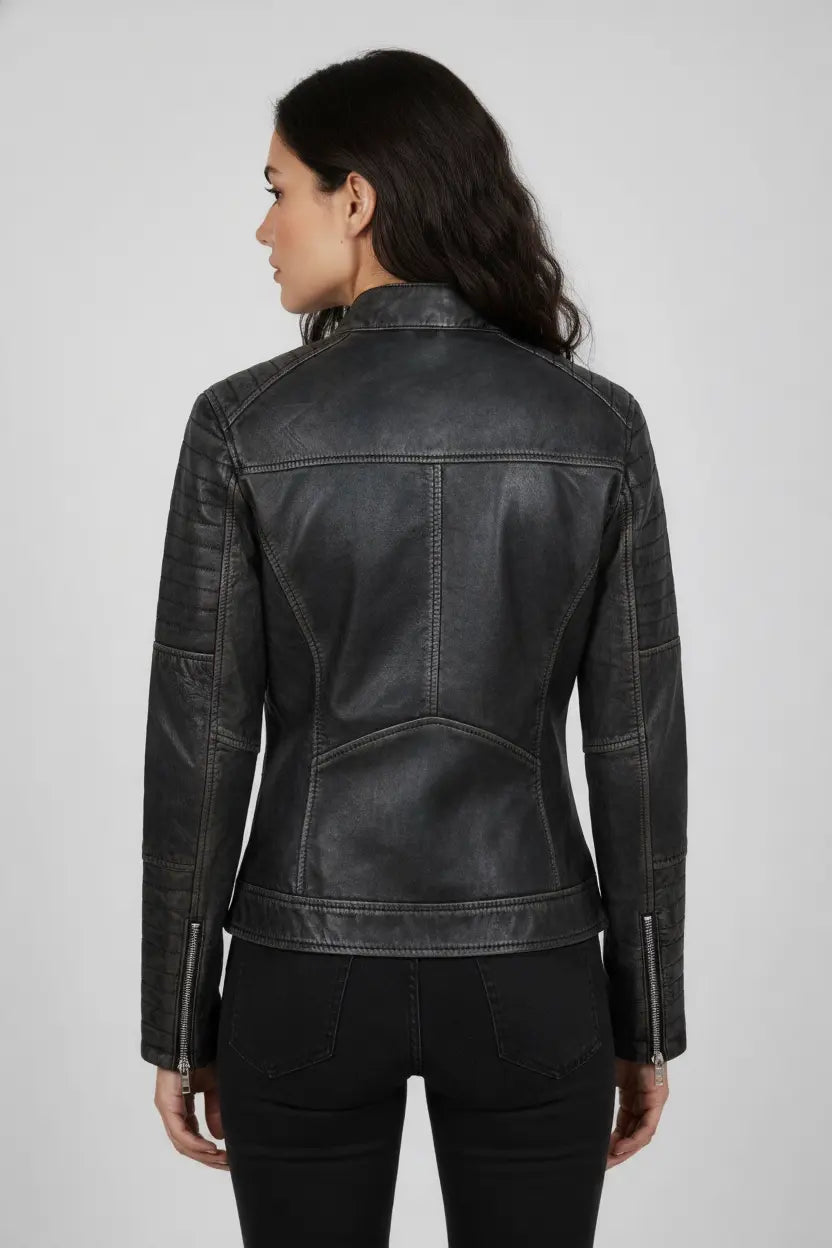 • Biker-inspired details including durable stitching and zip-up closure.