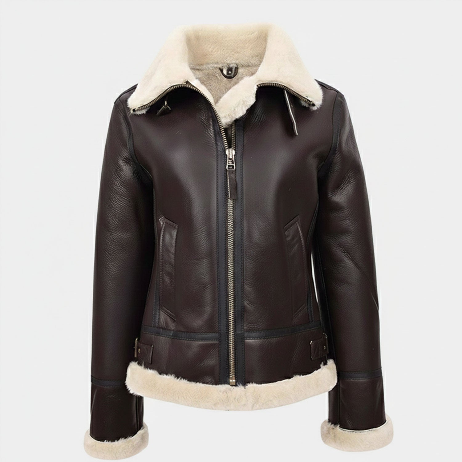The Women's Real Sheepskin Flying Jacket is a stylish and warm aviator-inspired coat. Made from genuine brown sheepskin leather and lined with soft shearling, this B3 pilot jacket features a cozy hood for added warmth, making it perfect for cold weather and aviation enthusiasts.
